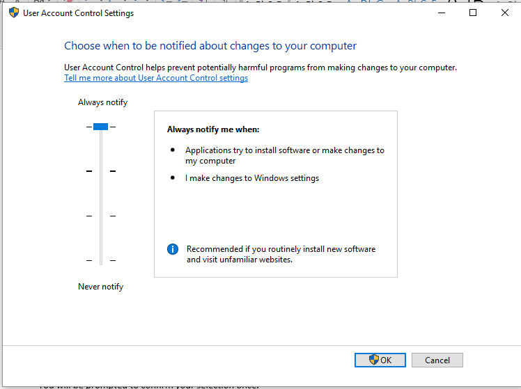If you want to turn off UAC, you need to drag the slider down to the last bar, as shown in the screenshot above. Then click on “OK”. You will be prompted to confirm your selection one time.