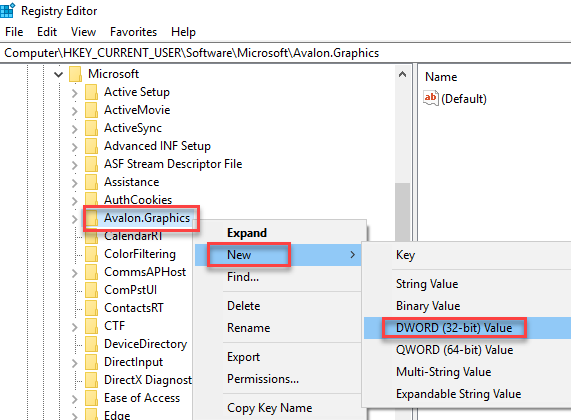 As you click the Microsoft option then locate the Avalon.Graphics option under this. Right click on it and choose the New -> DWORD (32-bit) Value as the following image is showing.