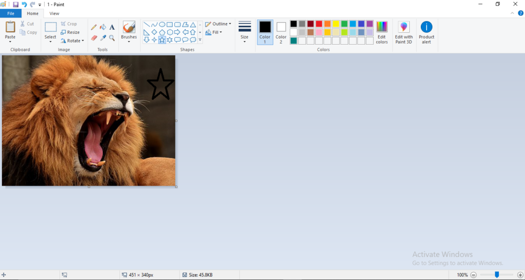 First, we will perform some editing on this picture. For doing this, click on any shape of your choice from the shapes tab. In this example, I have selected the star shape and have drawn a star on my picture as shown in the following image: