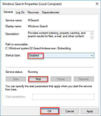 Choose Disabled option for Startup type option. It means that the next time you start your computer, Windows Search will not load. Then click the Stop button to stop the Windows service. When service will be stopped, then click the OK button as highlighted in the above image. Now Windows Search is disabled.